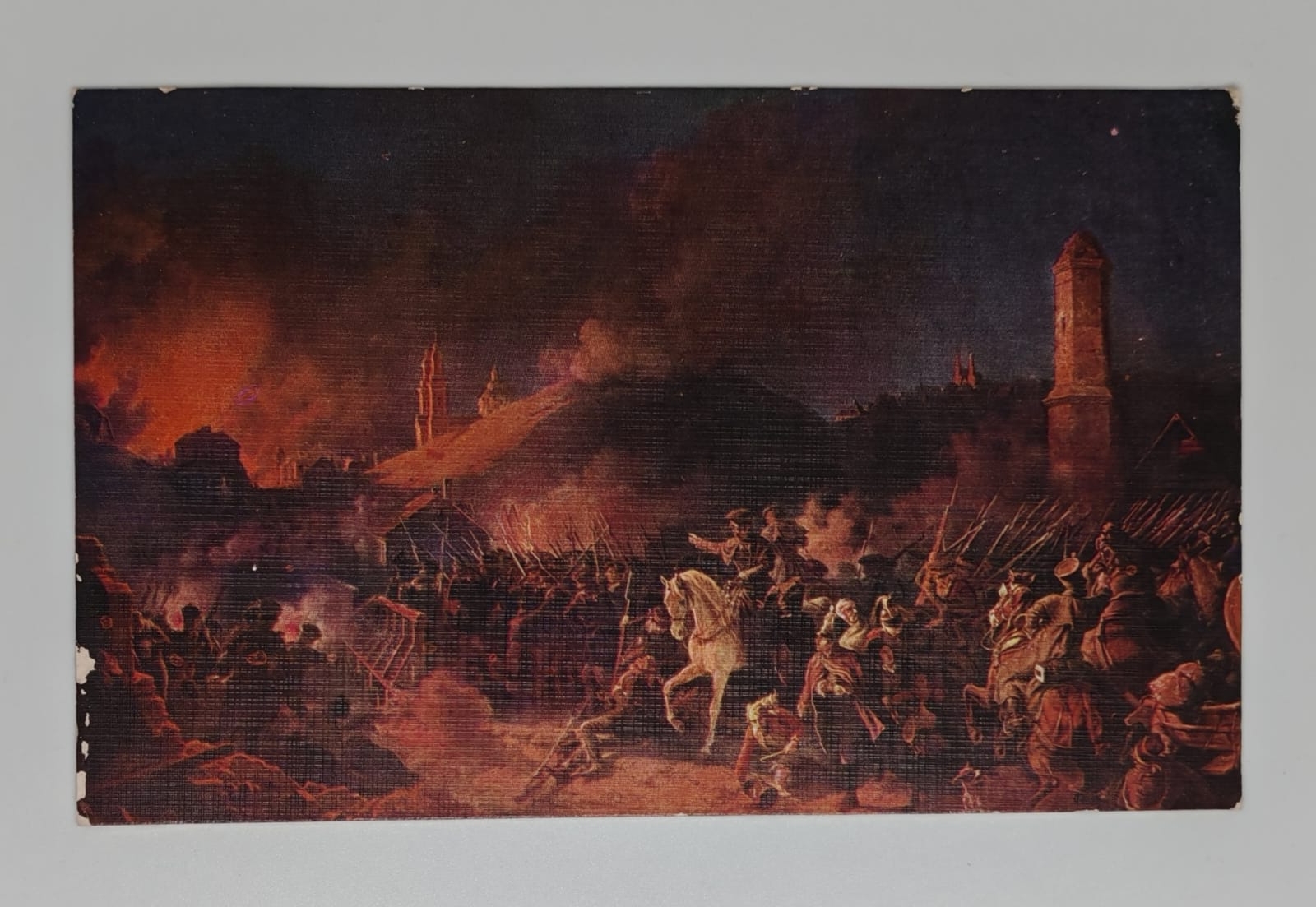 Original antique postcard depicting the Battle of Polotsk (Bataille de Polotsk), fought on 7 October 1812, one of the significant engagements of Napoleon’s Russian Campaign. The dramatic night scene — painted by Guesse — shows cavalry charges and infantry fighting under a smoke-filled sky, fires illuminating the chaos of battle across a wide panoramic composition typical of Romantic-era military art.