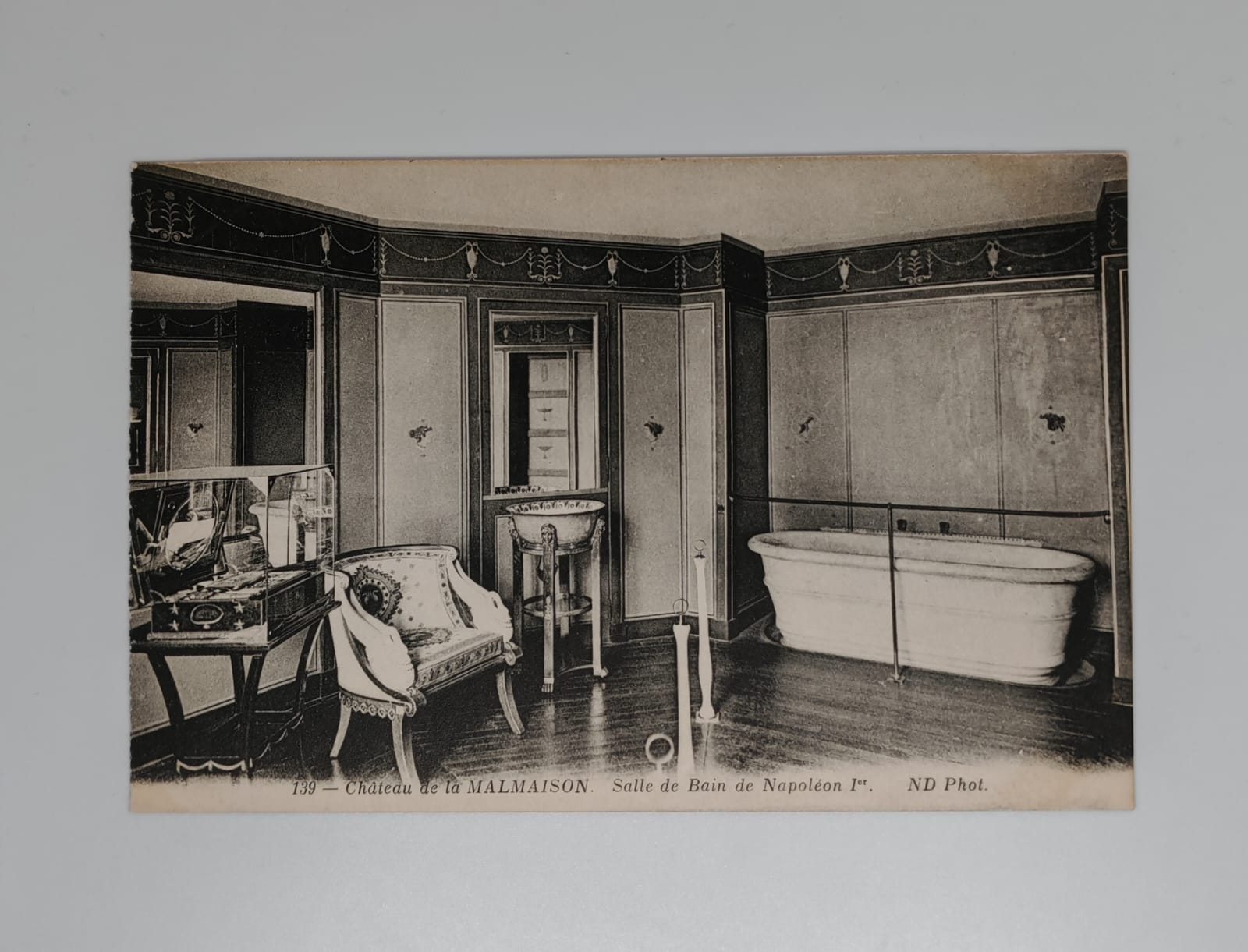 Original antique postcard depicting the private bathroom (Salle de Bain) of Emperor Napoleon I at the Château de la Malmaison. The photograph reveals a remarkably intimate space: a freestanding white porcelain bathtub dominates the right side of the room, while to the left stand an elegant Empire-style canapé, a dressing table with mirror and toiletry accessories, and a washstand with a gilded lion-head support. The walls are panelled and decorated with a refined neoclassical frieze featuring urns, swags, and floral motifs painted in the Pompeian manner. The parquet floor gleams beneath the composition, characteristic of the high craftsmanship of the Consulate period.