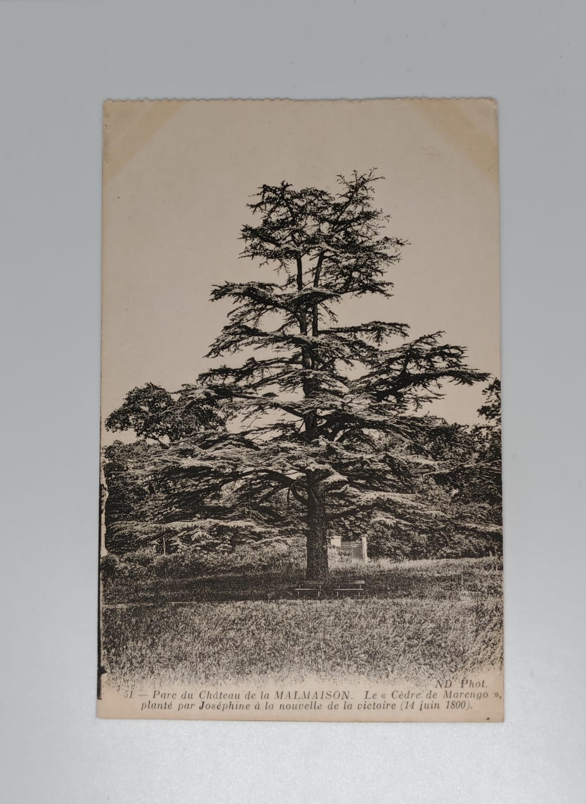 Original antique postcard showing the famous Cèdre de Marengo — the Cedar of Marengo — standing majestically in the park of the Château de la Malmaison. According to the caption, this cedar was planted by Empress Joséphine upon receiving news of Napoleon’s victory at the Battle of Marengo on 14 June 1800, one of the most decisive engagements of his Italian campaigns.