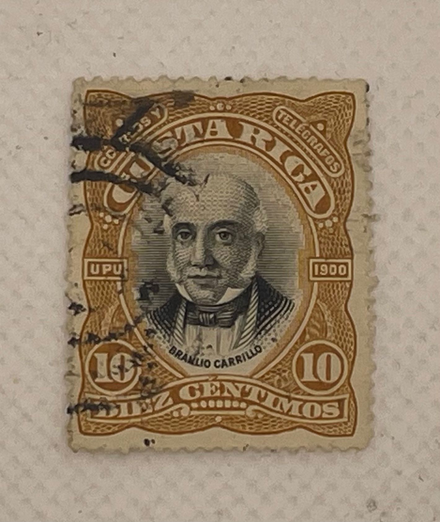 A used stamp from Costa Rica, the 1900 UPU issue featuring an engraved oval portrait of Braulio Carrillo Colina, printed in bicolour (black portrait on golden-yellow background). This is the used counterpart to the mint example in the same collection. Inscription reads Costa Rica, Correos y Telégrafos, UPU 1900, Braulio Carrillo, 10, Diez Céntimos.