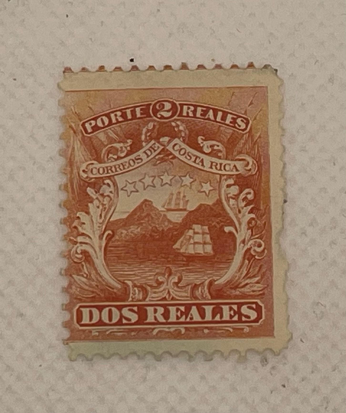 A mint unused stamp from Costa Rica, from the very early ‘Porte Reales’ definitive series issued by Correos de Costa Rica. The design features the Costa Rican coat of arms: a sailing ship in a bay surrounded by mountains, five-pointed stars and ornamental acanthus scrollwork. Inscription reads Porte 2 Reales, Correos de Costa Rica, Dos Reales. Printed in orange/vermilion.