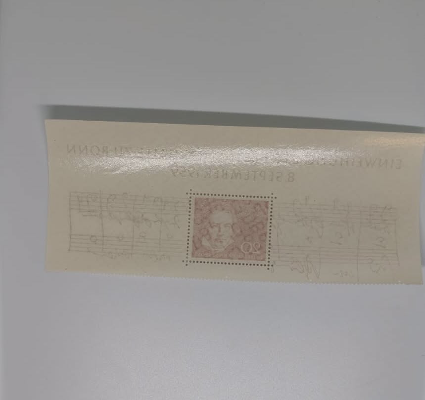 Souvenir sheet issued by Deutsche Bundespost for the inauguration of the Beethoven-Halle concert hall in Bonn, 8 September 1959. Features a 20pf stamp in red with a portrait of Ludwig van Beethoven and a facsimile manuscript excerpt from his 9th Symphony. Mint (MNH) condition. Note: marginal paper shows slight rolling at edges (visible on reverse); stamp itself is clean with full gum.