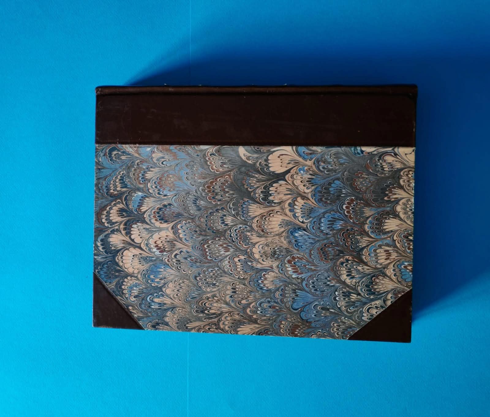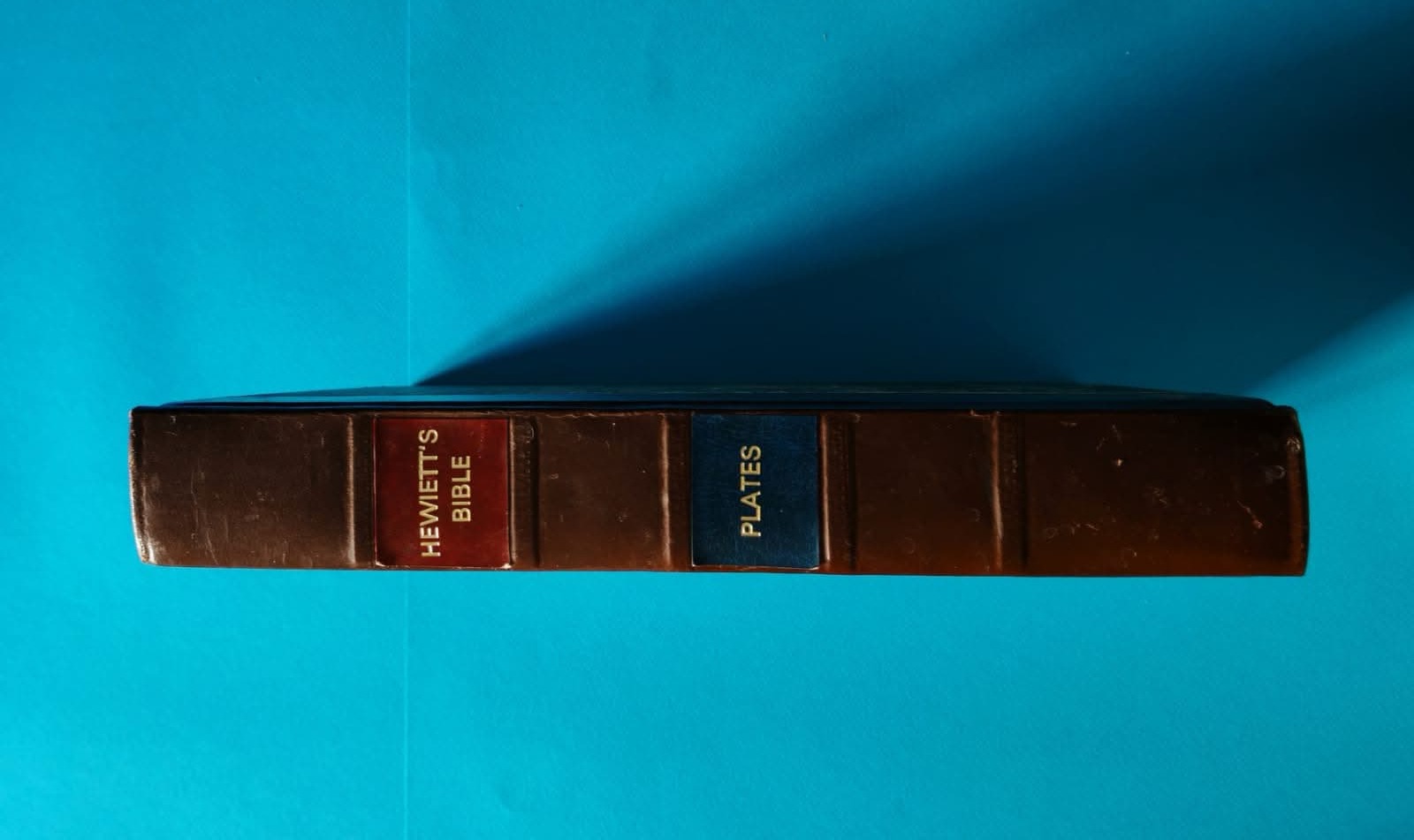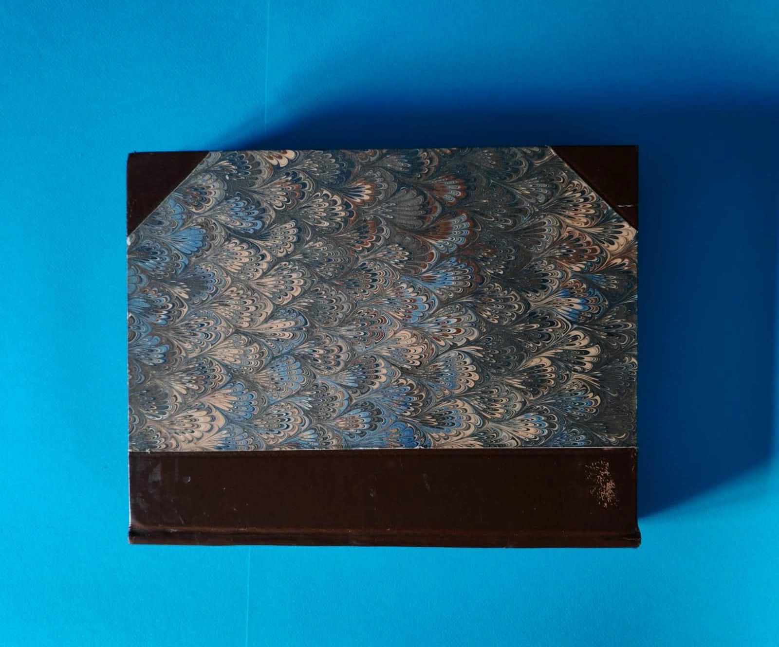Binding: Original half-leather binding with dark brown leather spine and corner pieces, marbled paper boards in a peacock/shell pattern of blue, cream and brown — characteristic of fine English bookbinding of the period. Spine with original gilt labels: Hewlett’s Bible and Plates.