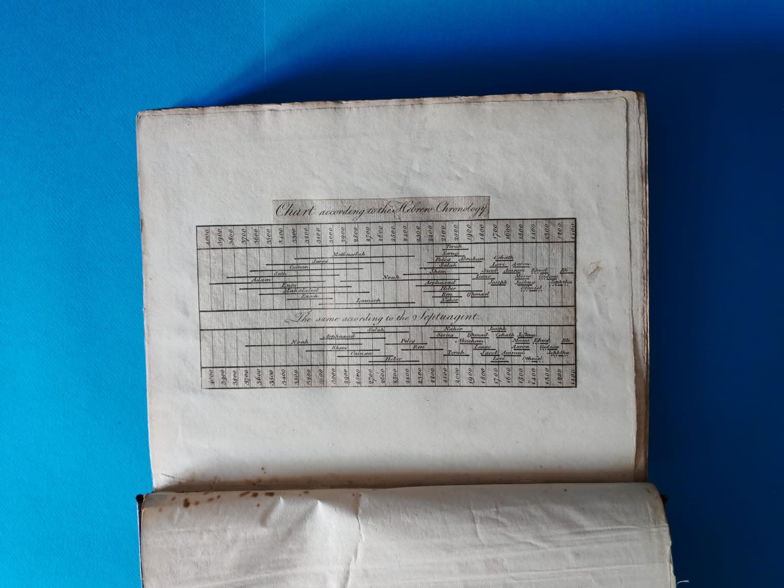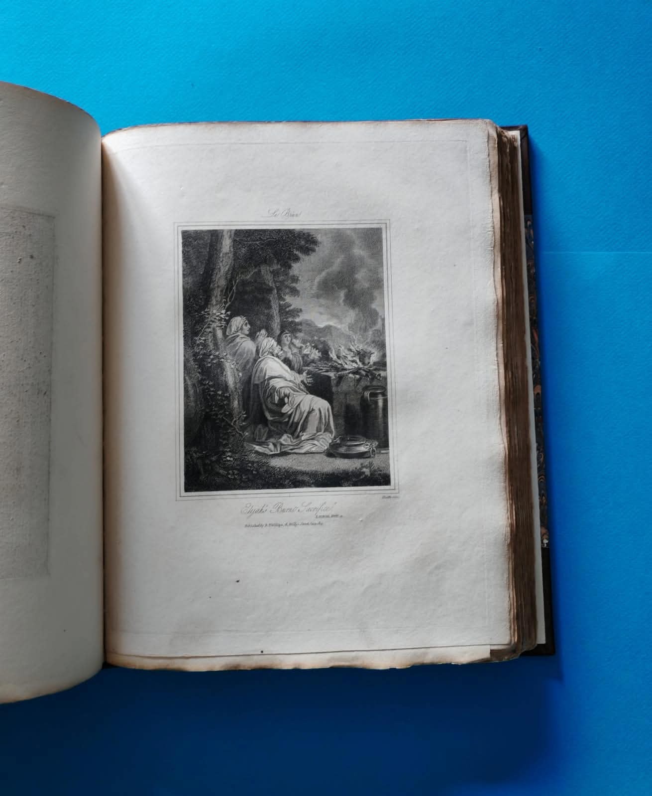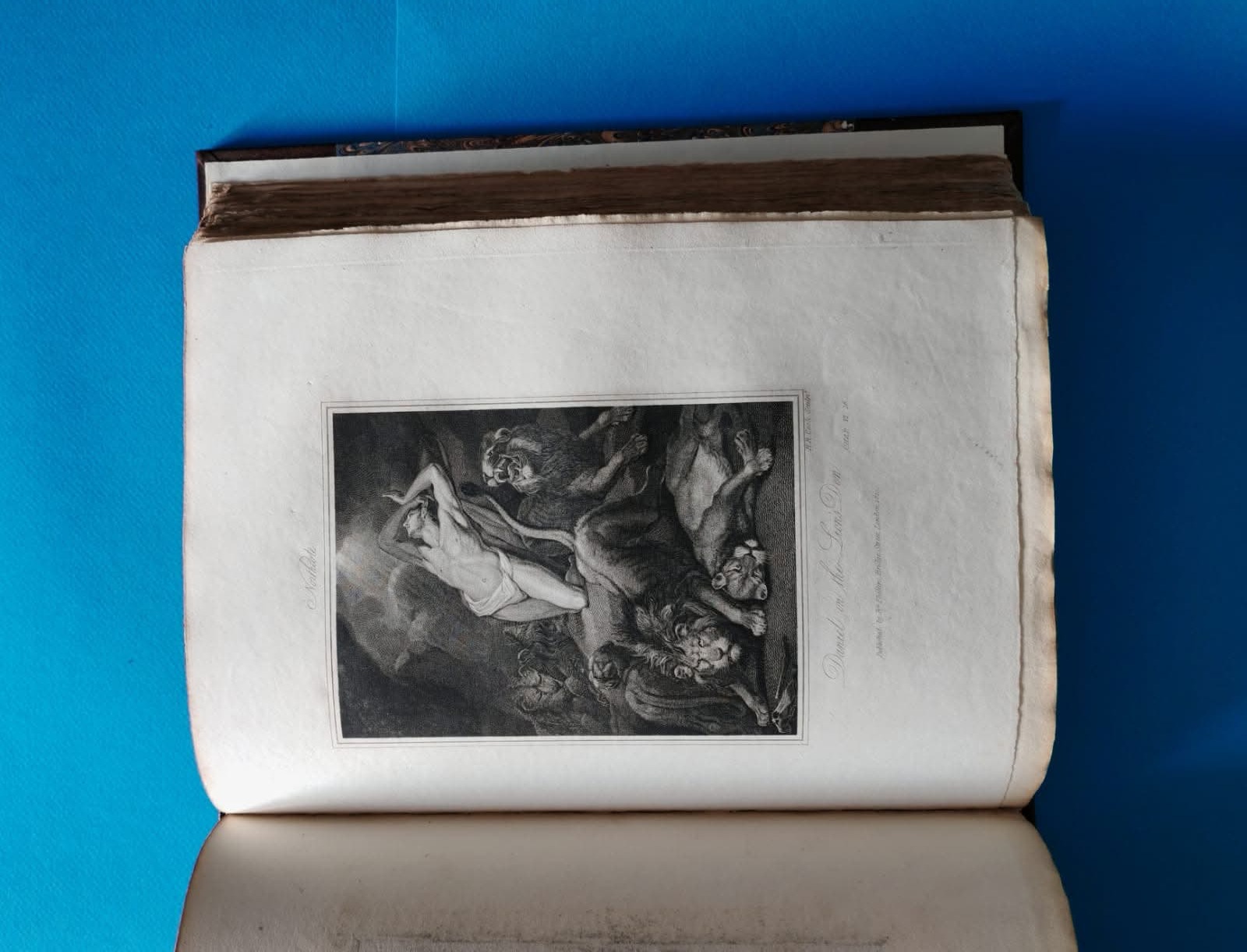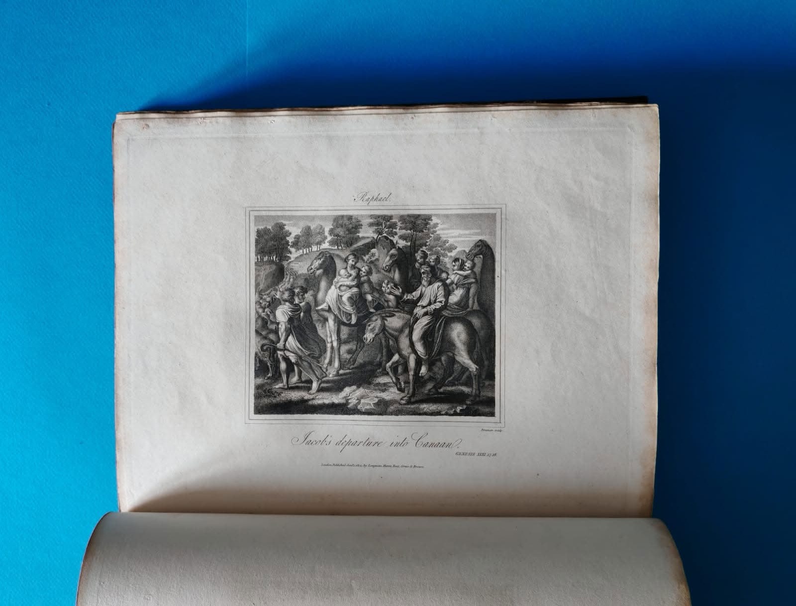 The volume contains a fine collection of copper engravings illustrating scenes from the Old and New Testament, including works after the great masters: Jacob’s Departure into Canaan and Rachel at the Well after Raphael, and Daniel in the Lions’ Den after Le Brun. Also included are two engraved maps — A Map of Palestine or the Holy Land and Map of Judaea — and a Chronological Chart comparing Hebrew and Septuagint chronologies.