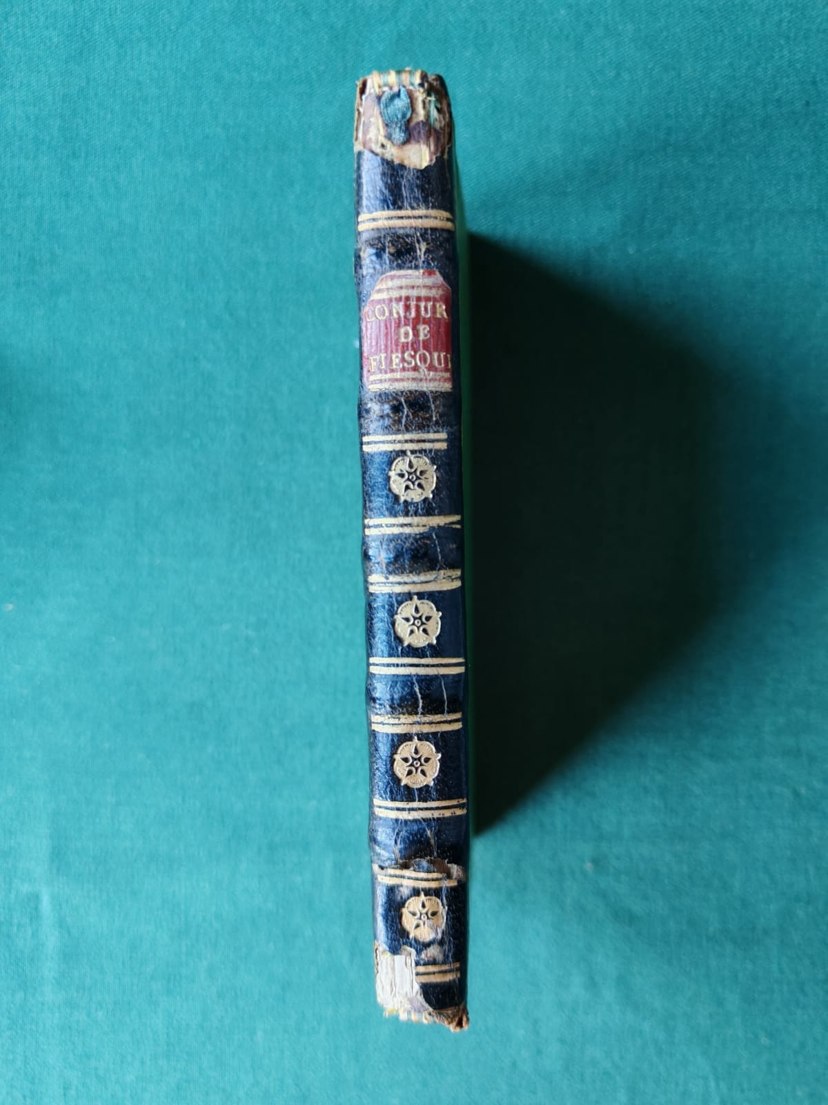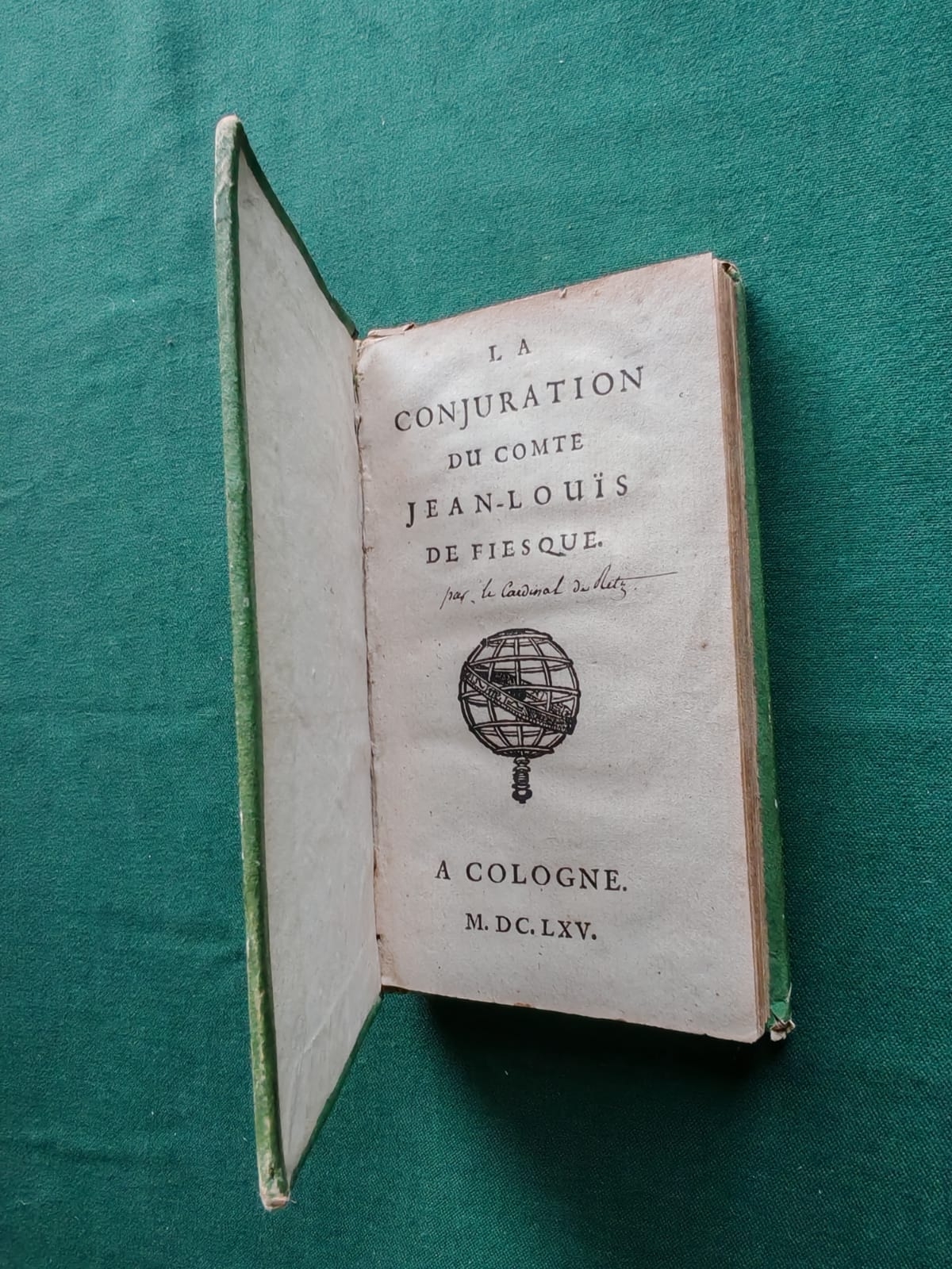 Rare first Elzevier edition of La Conjuration du Comte Jean-Louis de Fiesque by Cardinal de Retz, 1665. Poor condition, original 17th-century binding.