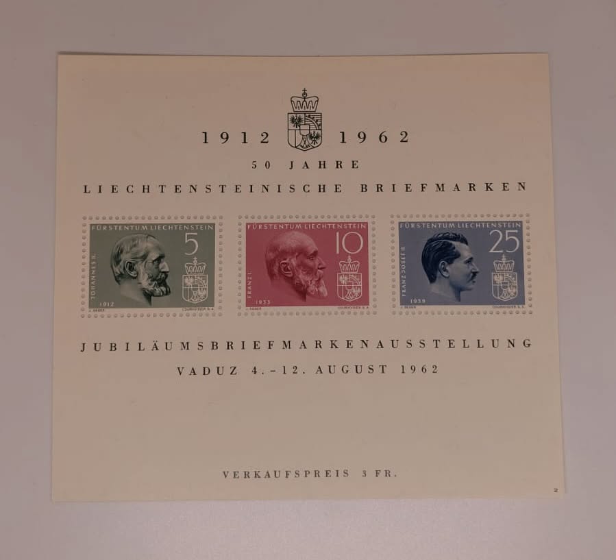 Liechtenstein 1962 Souvenir Sheet – 50th Anniversary of Liechtenstein Stamps