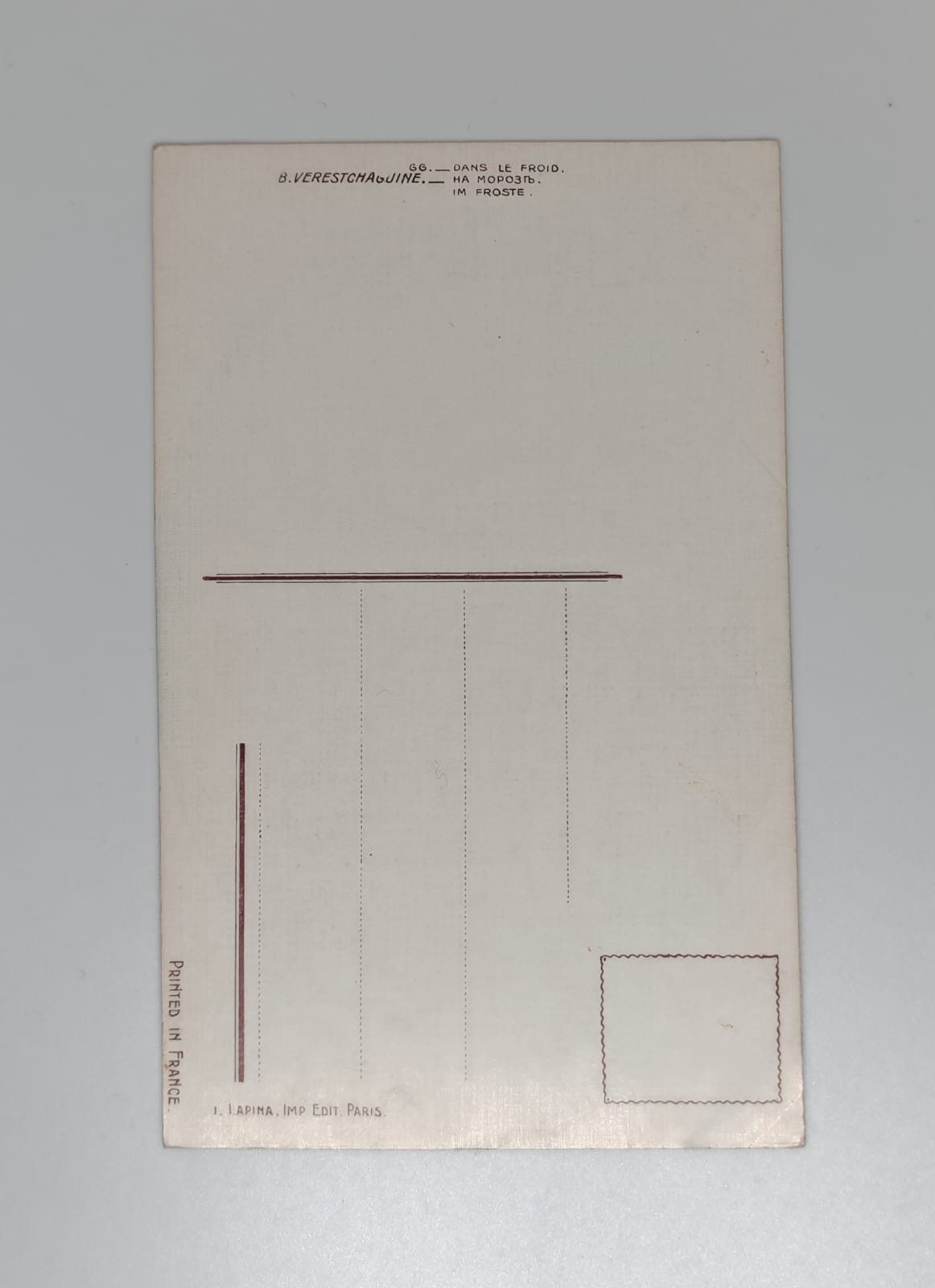 The caption reads: «06 — DANS LE FROID. — IN THE FROSTE. B.VERESTCHAGUINE.» Published by J. Lapina, Imp. Edit. Paris — one of the leading French postcard publishers of the Belle Époque era. Vereshchagin’s Napoleonic series became iconic representations of the 1812 campaign and remain highly regarded by collectors of militaria and art history postcards.