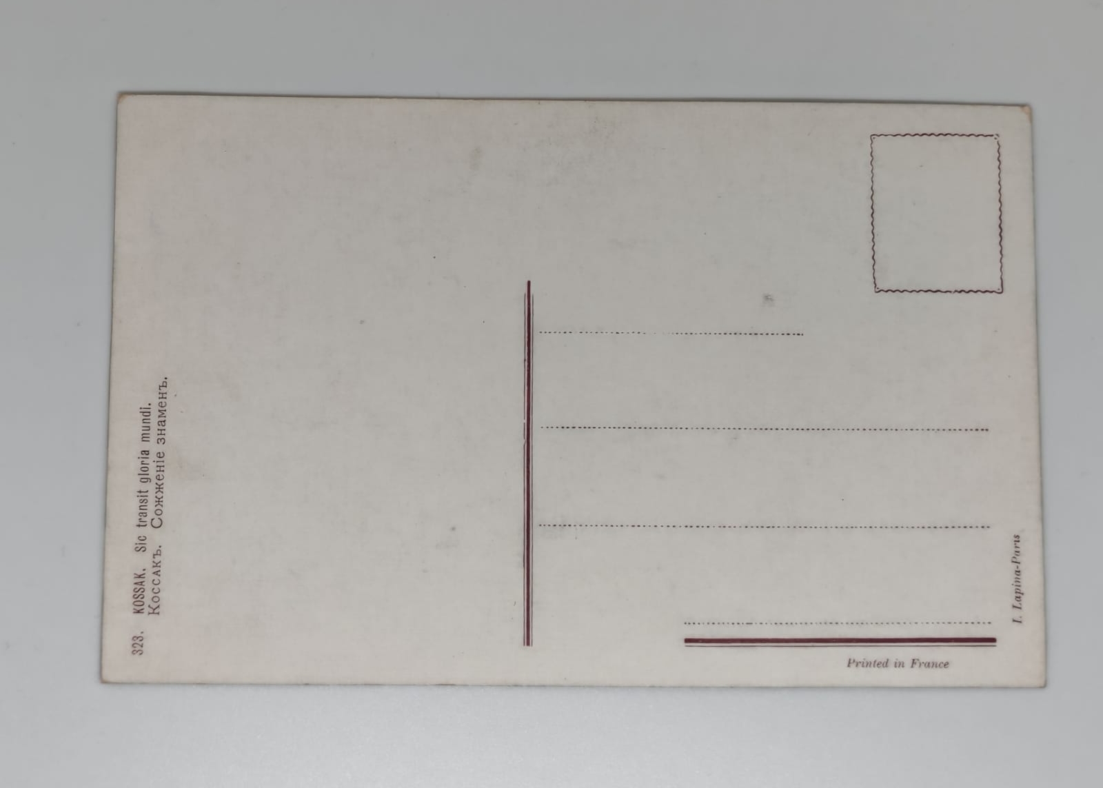 Antique postcard reproducing the painting by Wojciech Kossak depicting Napoleon Bonaparte seated by a campfire watching soldiers burn the army’s battle flags during the catastrophic retreat from Moscow in 1812. The Latin title “Sic transit gloria mundi” (Thus passes the glory of the world) captures the symbolic weight of the scene. Russian subtitle on reverse: “Сожженiе знаменъ” (Burning of the flags). Kossak was a celebrated Polish battle painter renowned for his Napoleonic series. Published by J. Lapina, Imp. Edit. Paris, No.323. Printed in France. Reverse blank and unused, very clean condition — no foxing, no toning. Front in Very Good condition.