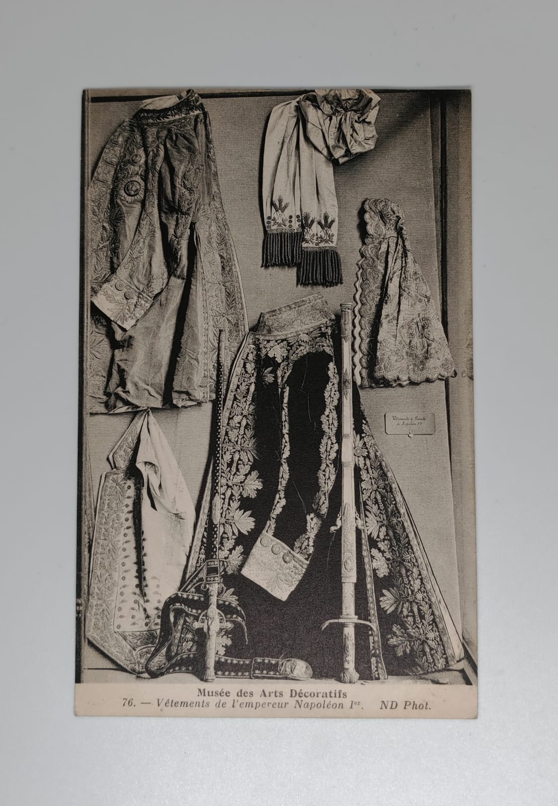 Original antique postcard depicting the coronation regalia of Emperor Napoleon I on display at the Musée des Arts Décoratifs, Paris. The photograph shows the imperial coronation coat, ermine-trimmed mantle, ceremonial sash, lace cuffs, and sword as exhibited in the museum’s collection. Published by Neurdein Frères (ND Phot.), a leading French photographic publisher of the Belle Époque era.