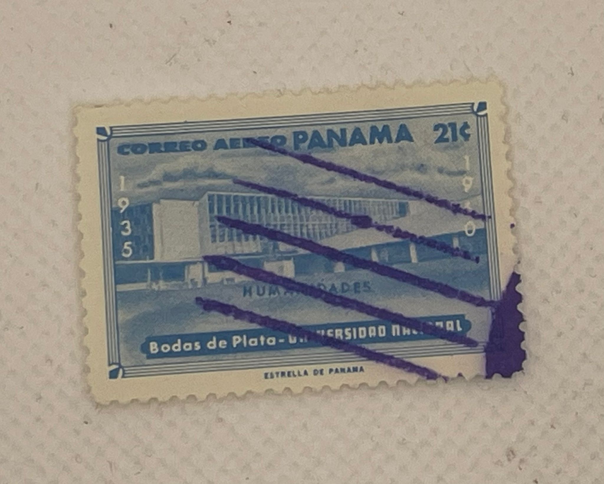 Used 1960 Panama airmail stamp – 21¢ commemorating the 25th anniversary of Universidad Nacional. Depicts the Faculty of Humanities building. Diagonal bar cancellation. Available at EdiTrade UK.