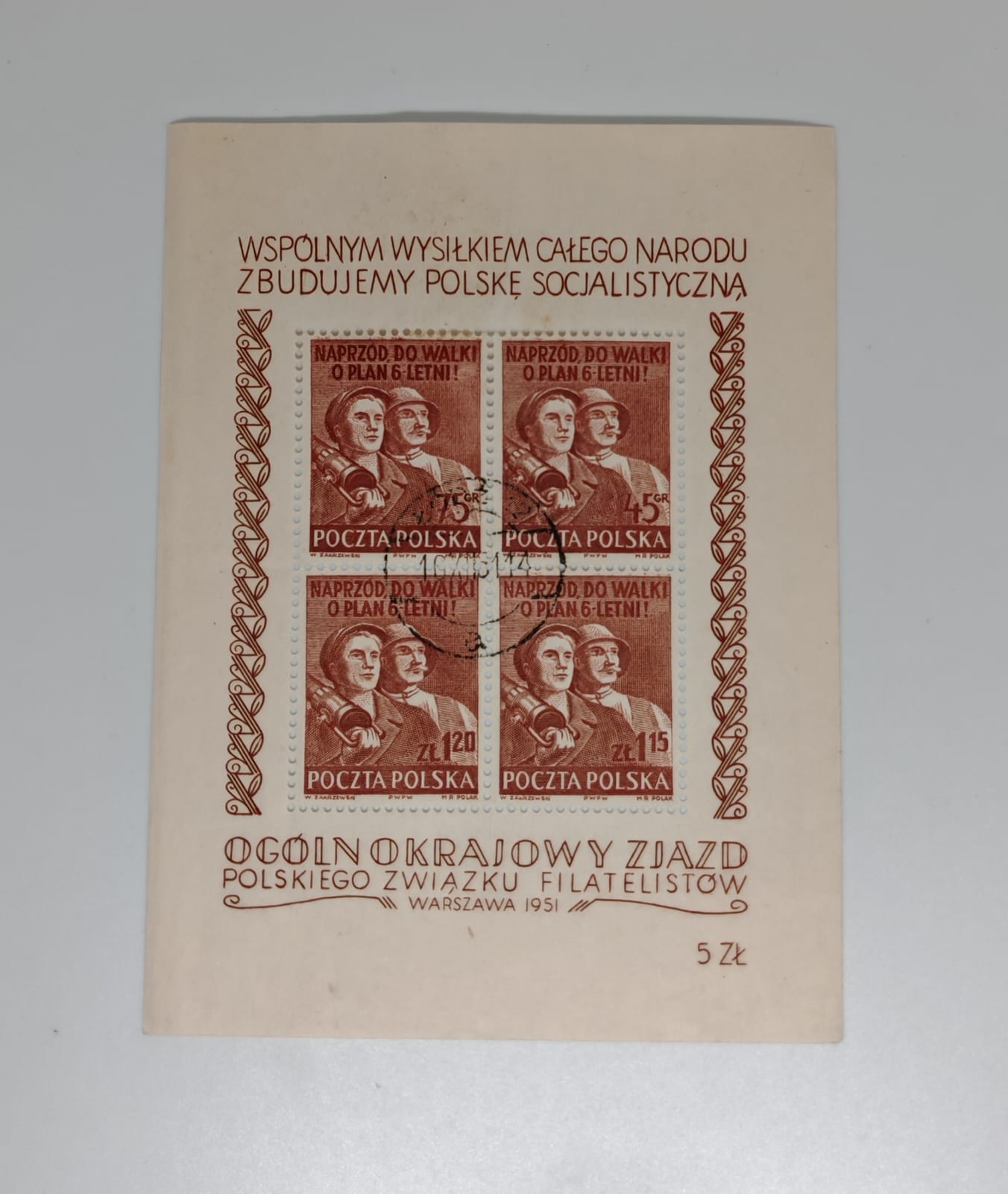 Original Polish souvenir sheet issued on the occasion of the National Congress of the Polish Philatelic Union (Ogólnokrajowy Zjazd Polskiego Związku Filatelistów), Warsaw 1951. The sheet bears four stamps from the «Naprzód do walki o Plan 6-letni!» (Forward to the Fight for the 6-Year Plan!) series, a defining example of Polish Socialist Realist stamp design of the early 1950s.
