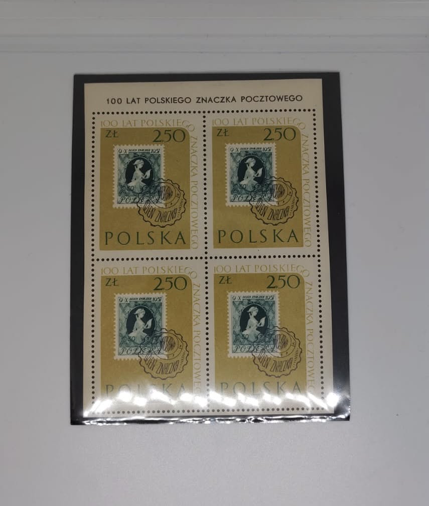 Block of 4 used stamps from Poland 1960 commemorative issue marking the centenary of the first Polish postage stamp. Each stamp has a 2.50 złoty denomination with gold and olive background featuring a stamp-within-stamp motif showing a woman writing a letter. Circular cancellation on each stamp. Sheet margin inscription “100 LAT POLSKIEGO ZNACZKA POCZTOWEGO” visible at the top. Perforations intact on all sides. Clean used block in protective sleeve.