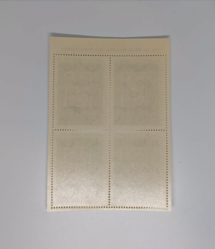 A block of four from the 1960 Polish commemorative issue marking 100 Lat Polskiego Znaczka Pocztowego — the centenary of the first Polish postage stamp. Each stamp depicts the original 1860 issue within a stylised circular postmark motif, printed in green, red, and blue.