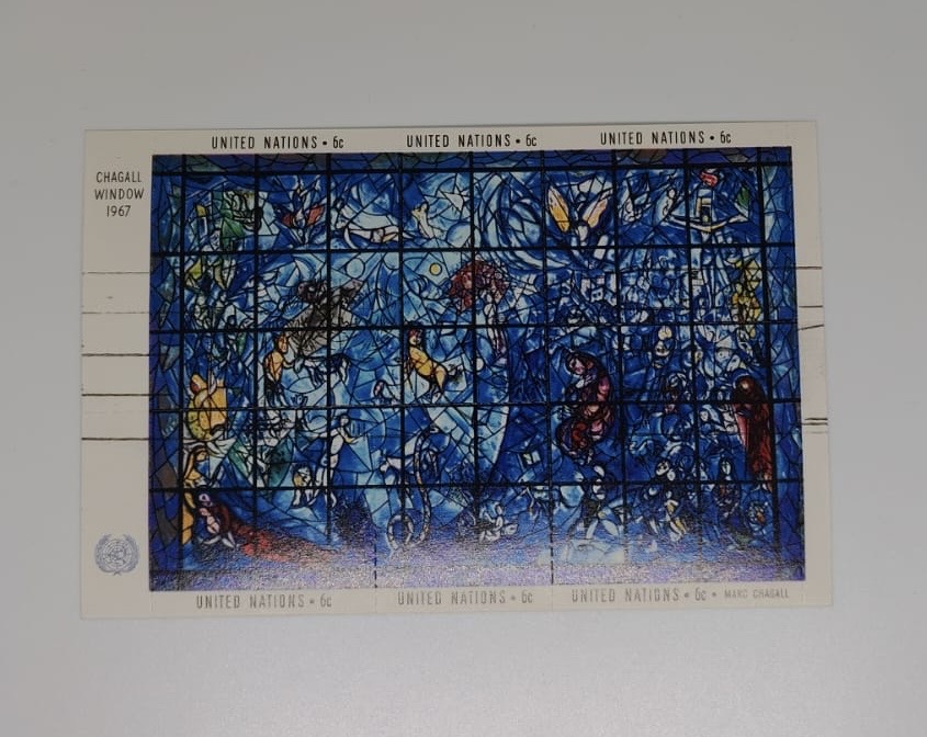 Mint souvenir sheet from United Nations 1967 featuring Marc Chagall’s stained glass artwork.